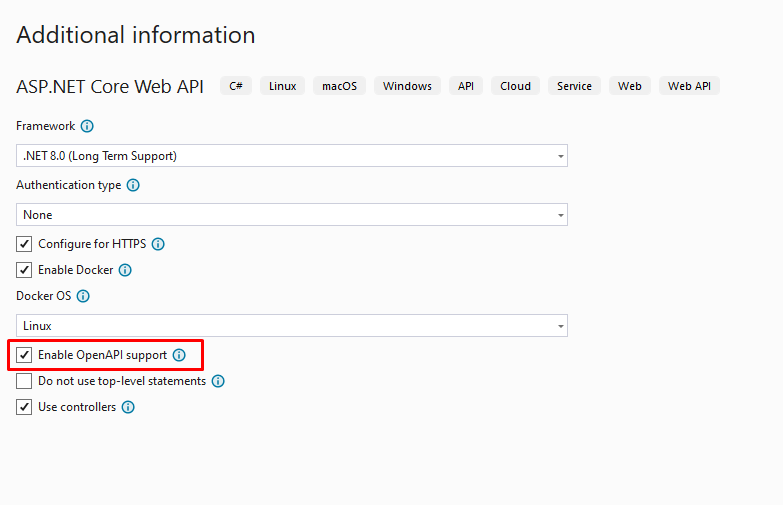 In addition, when starting a new project in Visual Studio, you have the option to automatically enable Swagger support. During the project setup, simply check the box that says ”Enable OpenAPI support” or similar (the exact wording may vary depending on the version of Visual Studio). This convenience feature streamlines the setup process by automatically including the necessary Swagger dependencies and configuration in your new project.