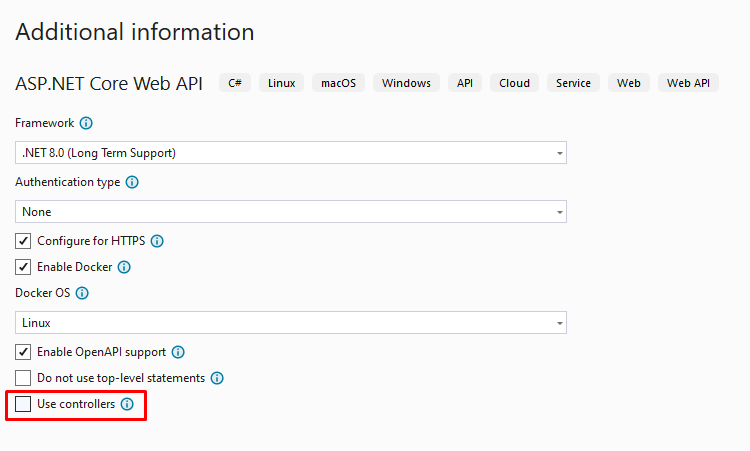 While the initial steps to set up Swagger in minimal APIs are similar to those in controller-based APIs, the key difference lies in how the endpoints are defined and configured. In minimal APIs, there are several methods to annotate and document your endpoints for Swagger. It’s also important to note that if you are starting your project with Visual Studio, you should uncheck ”Use controllers” checkbox in order to use minimal APIs.